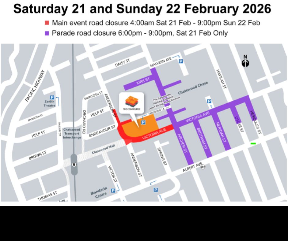 To safely accommodate the event and large crowds, roads surrounding Chatswood Chase will be closed from 4am on Saturday 21 February until 9pm on Sunday 22 February.